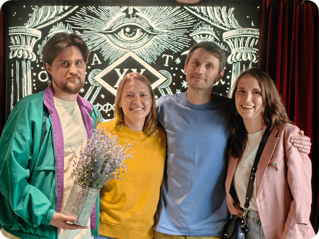 На защите проекта. Слева направо: я — Дмитрий Черников, хозяйка дачи — Катерина Перепёлкина, арт-директор — Илья Бирман, редактор — Марина Клиновенко