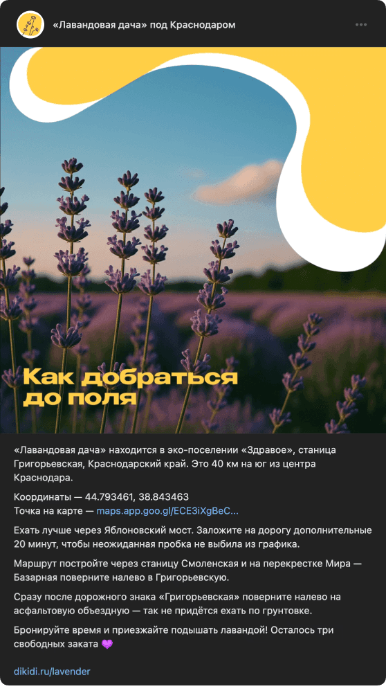 Редактор писала посты, исходя из реальных вопросов клиентов: как добраться, сколько стоит, что взять с собой. Это снижало количество личных запросов и помогало людям самостоятельно принять решение.